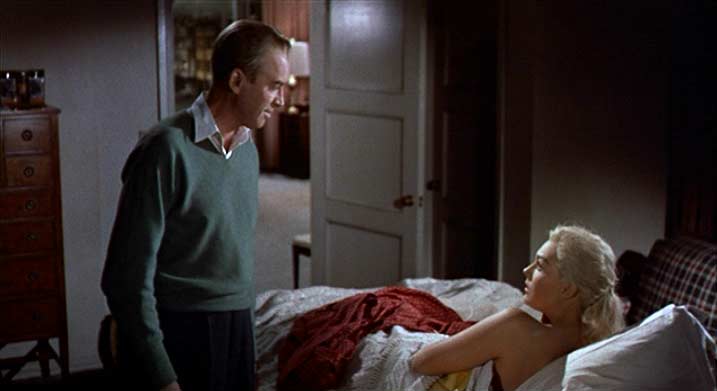 Scottie waits in the room, by the green window, for Judy to return from her makeover; when she does, her hair is bleached but still dressed the wrong way. It’s not enough for him that she has Madeleine’s face and body: she has to wear the same suit, the identical hairdo. He wasn’t in love with a woman but with a manufactured image, an artificial soul. It seems improbable that a man begging a woman to pin her hair up could be a moment of great import, but Scottie’s plea, at once abject and cruelly manipulative (“Please, Judy”), and Judy’s crushed acquiescence, amount to a scene of the most exquisite emotional violence. He can hardly breathe as he waits for her to emerge from the bathroom; he’s waiting for the return of the dead. When she appears, she stands in a column of green light, pale and misty as a ghost, gathering substance and color as she walks toward him. Only then does he kiss her, as the camera circles around them—perhaps the most rapturously disturbing kiss in the movies.